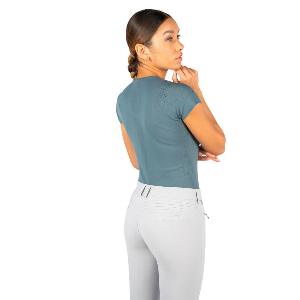 Bei dem T-Shirt Luana von Samshield handelt es sich um ein besonderes Modell. Es besteht zu 100 % aus Nylon 6.6 und ist nahtlos verarbeitet. So können keine Druckstellen oder Reibung am Körper entstehen. Der gerippte Saum hindert das Shirt am Verrutschen und hält es an seinem Platz. Für einen hohen Tragekomfort sorgen der Rundhalsausschnitt und die atmungsaktiven Einsätze an Rücken und Brust. Auch optisch überzeugt das Shirt durch seine Blazons auf der Vorder- und Rückseite, wobei das Logo an der Brust mit Swarovskisteinen verziert ist.