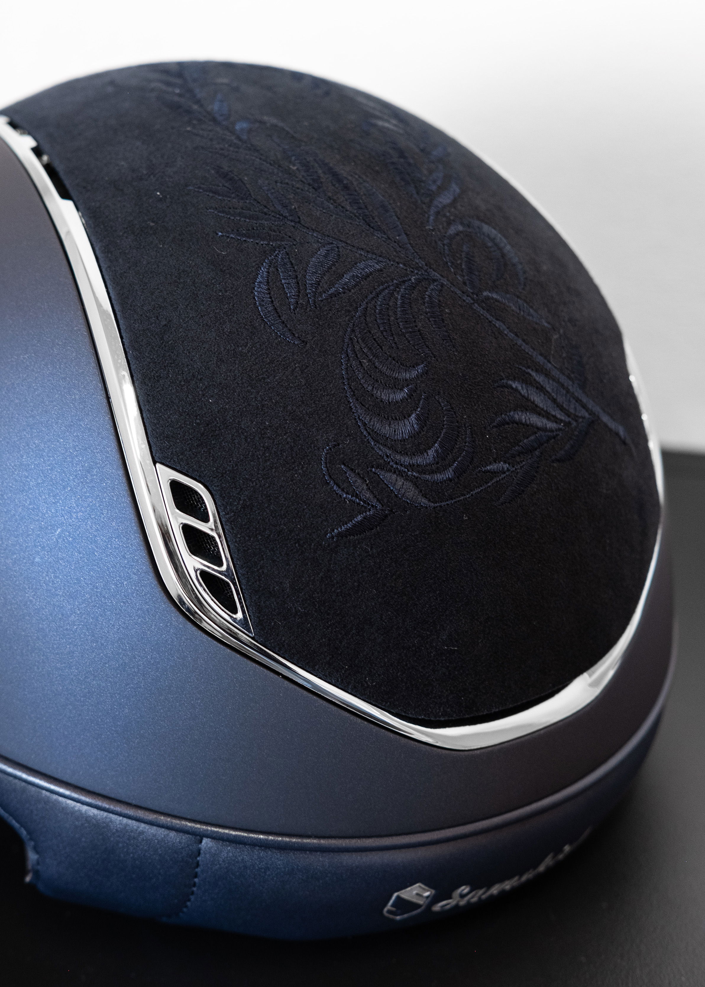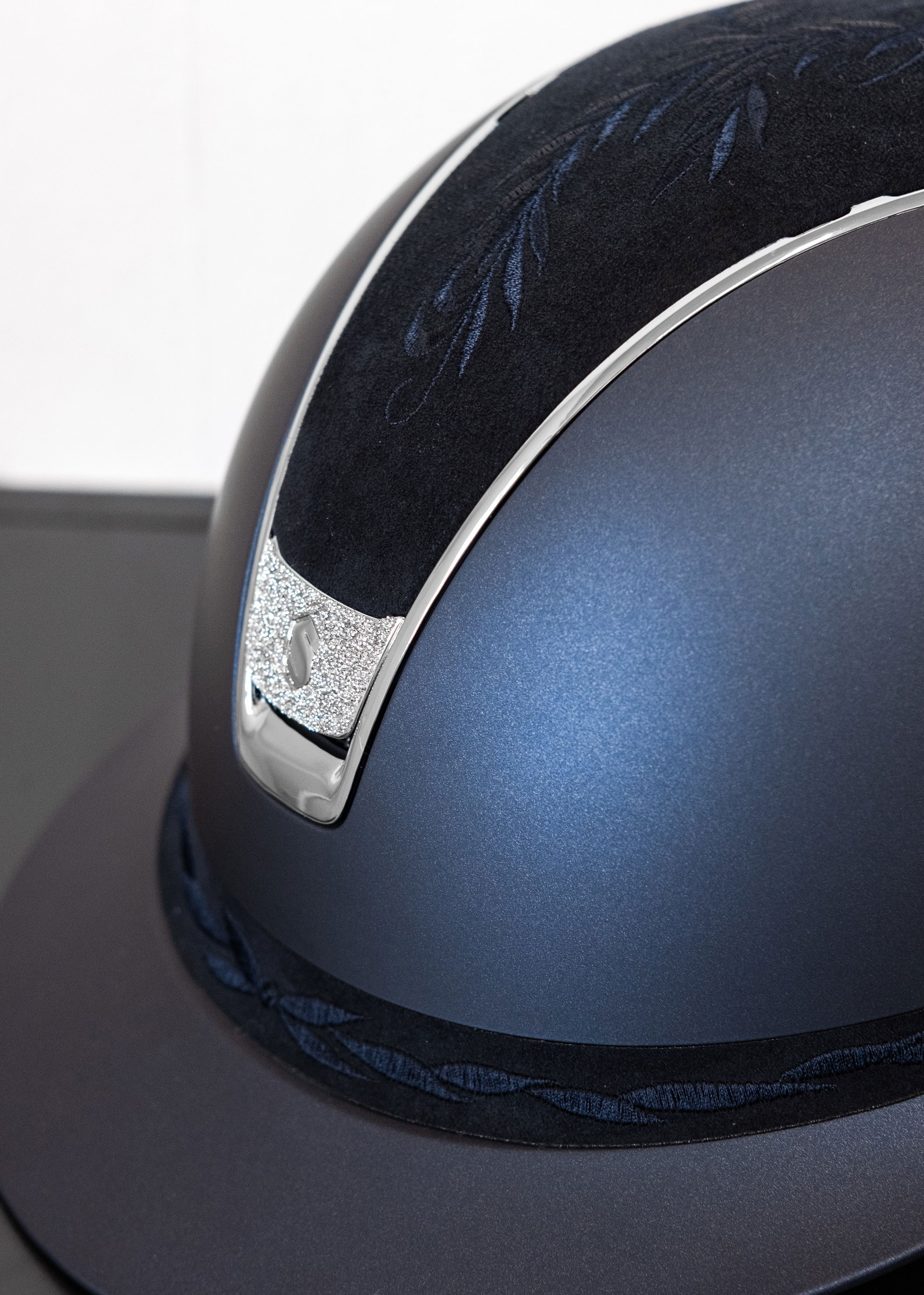 - Flower Embroidery und Crystal Fabric Silver Blason verleihen dem Helm ein optisches Highlight